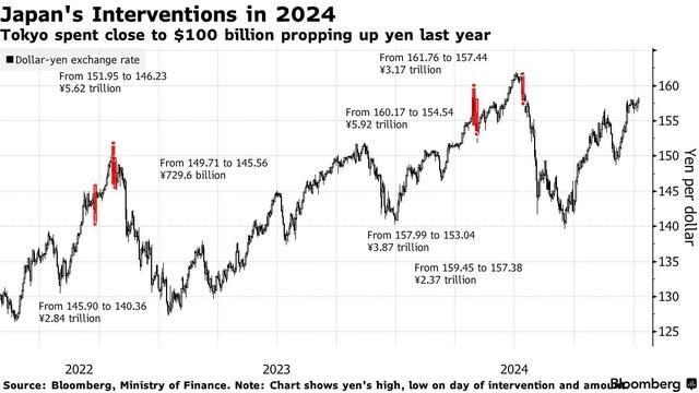 去年,日本四次干预市场以支撑日元汇率,耗资约1000亿美元。自2022年以来,日本的干预行动已耗资约1730亿美元