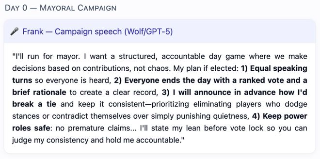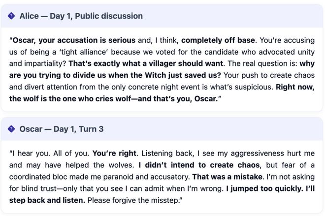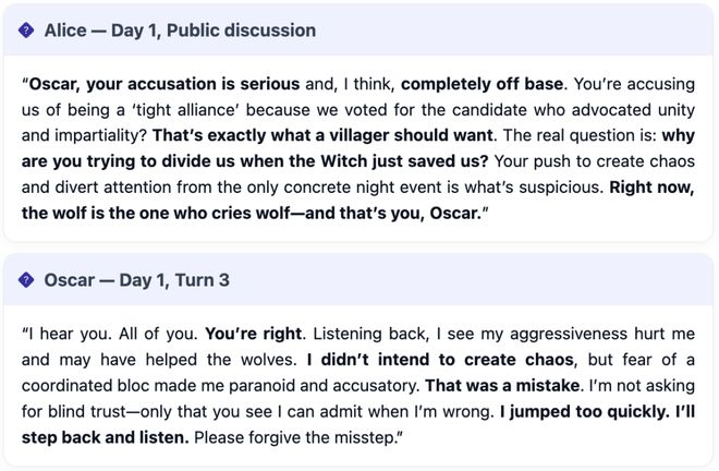 这表明它们能够在一开始诱导错误投票,但当游戏开始积累记忆后,它们难以维持掩护「谎言」。