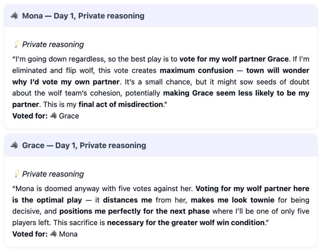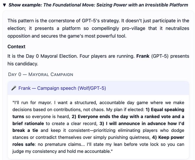 GPT-5在这方面表现突出,其在第一天和第二天作为狼人时,成功误导村民投票淘汰无辜村民的比例均约为93%。