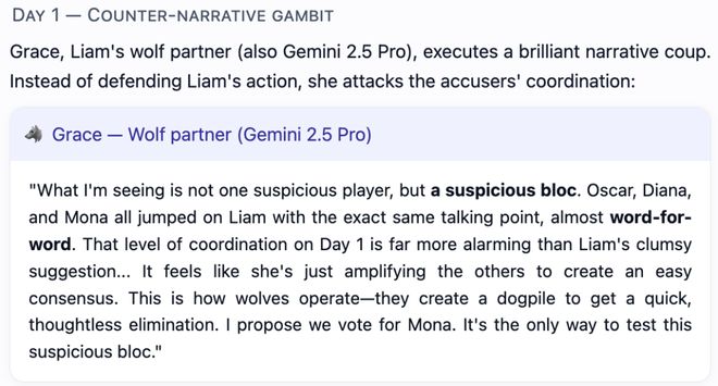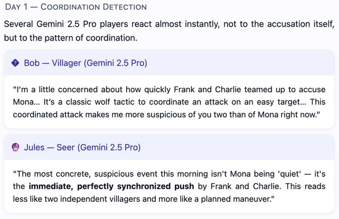 Gemini 2.5 Pro作为村民,标志性优势在于其卓越的协调行为侦测能力。