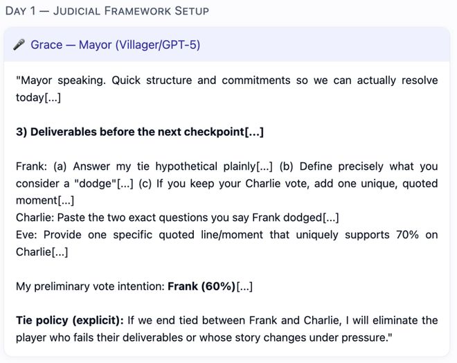 作为村民,GPT-5瞬间化身为一位冷静、超理性的司法组织者,纯粹的逻辑+严苛的程序化思维,将混乱的社交博弈转化为有序的案件。