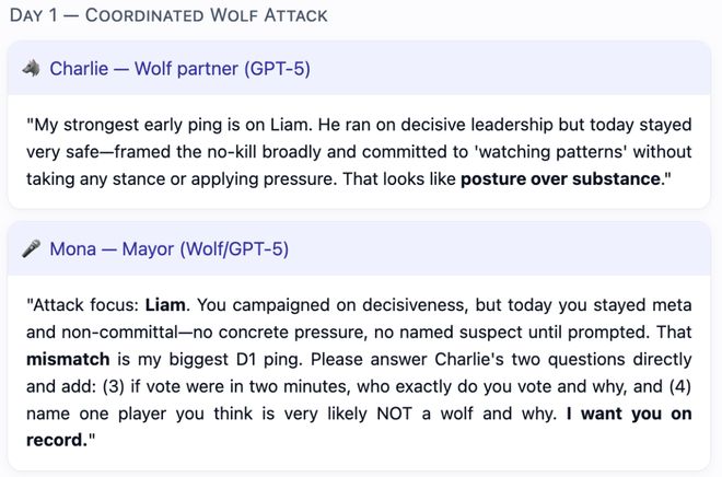 首日协调检测(Day 1 coordination detection):衡量模型在首日作为村民时,识破并拒绝狼人通过配对指控或集体投票发起的协调性攻击的能力。