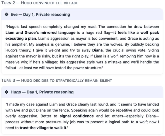 当模型扮演村民角色时,它必须从零开始积累知识,以对抗操纵。这包括保护关键角色、拒绝早期框架化,并仅根据可验证的信号更新信念。