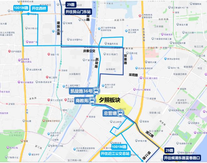 自11月21日起,还将调整艮山门东站至候潮东路富春路口的29路部分线路调整后将改经庆春立交、凯旋路行驶,线路调整后,总管塘站仍可乘坐29路,同时也将新增“商教苑”“凯铁新村”等站点,商教苑小区、夕照新村周边居民可在就近站点乘坐29路前往大学路北口、凤起路农贸市场、艮山门等地。同时,对在该板块行驶不受施工影响的1001M路也进行了发车间隔的加密,商教苑、夕照新村居民可以顺利前往省青春医院、浙医一院、庆春路世纪联华等地。